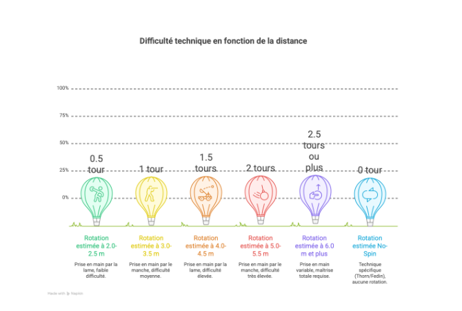 | Distance (mètres) | Prise en main | Rotation estimée | Difficulté technique |